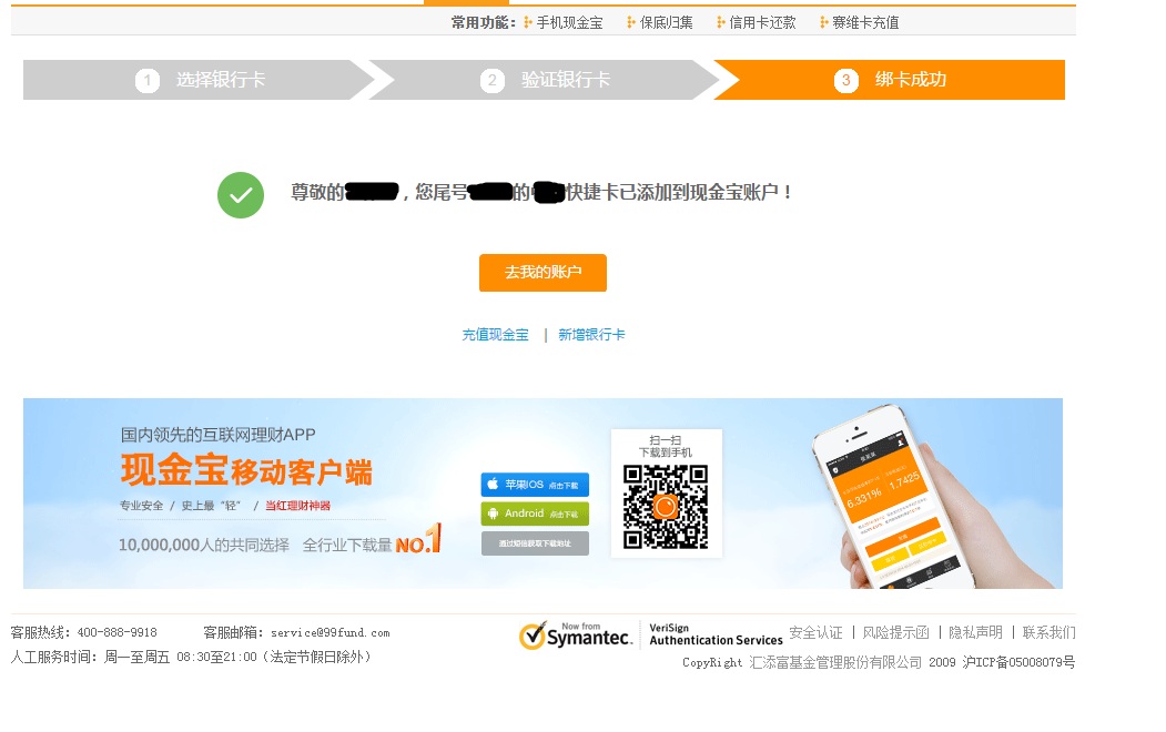 5、銀行卡添加成功,可以充值現(xiàn)金寶或購(gòu)買(mǎi)基金、理財(cái)產(chǎn)品等。