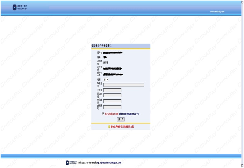 6.網(wǎng)頁會自動跳轉(zhuǎn)至“銀聯(lián)通業(yè)務(wù)開通步驟二”頁面,輸入相關(guān)的個人信息,點擊“開戶”