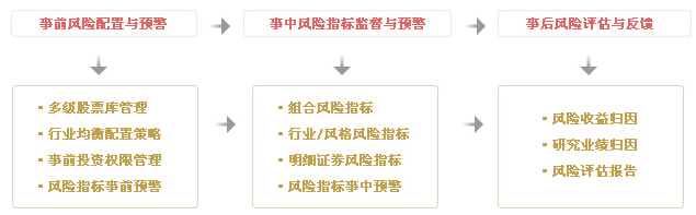 • 運用合理有效的風險指標和模型,實現(xiàn)風險事前配置和預(yù)警、事中實時監(jiān)控、事后評估和反饋的全程嵌入式投資風險管理模式。
