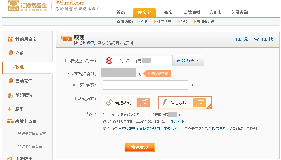 1、現(xiàn)金寶快速取現(xiàn)是一種增值服務(wù),我司每日設(shè)置快速取現(xiàn)總額度上限,如達上限快速取現(xiàn)服務(wù)將臨時暫停,投資者在使用快速取現(xiàn)服務(wù)前充分了解該風險,并仔細閱讀快速取現(xiàn)相關(guān)的服務(wù)協(xié)議,盡量提前做好資金安排。