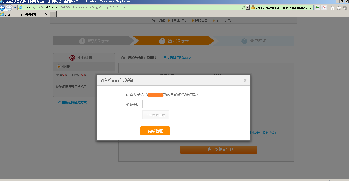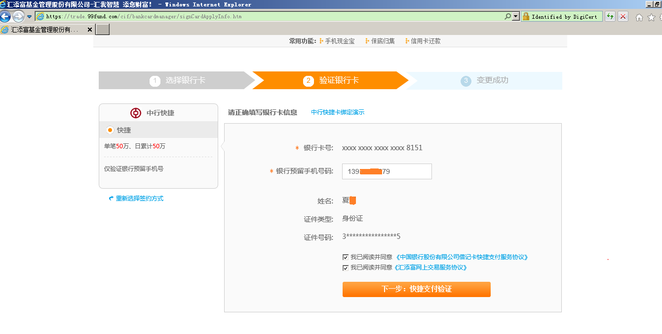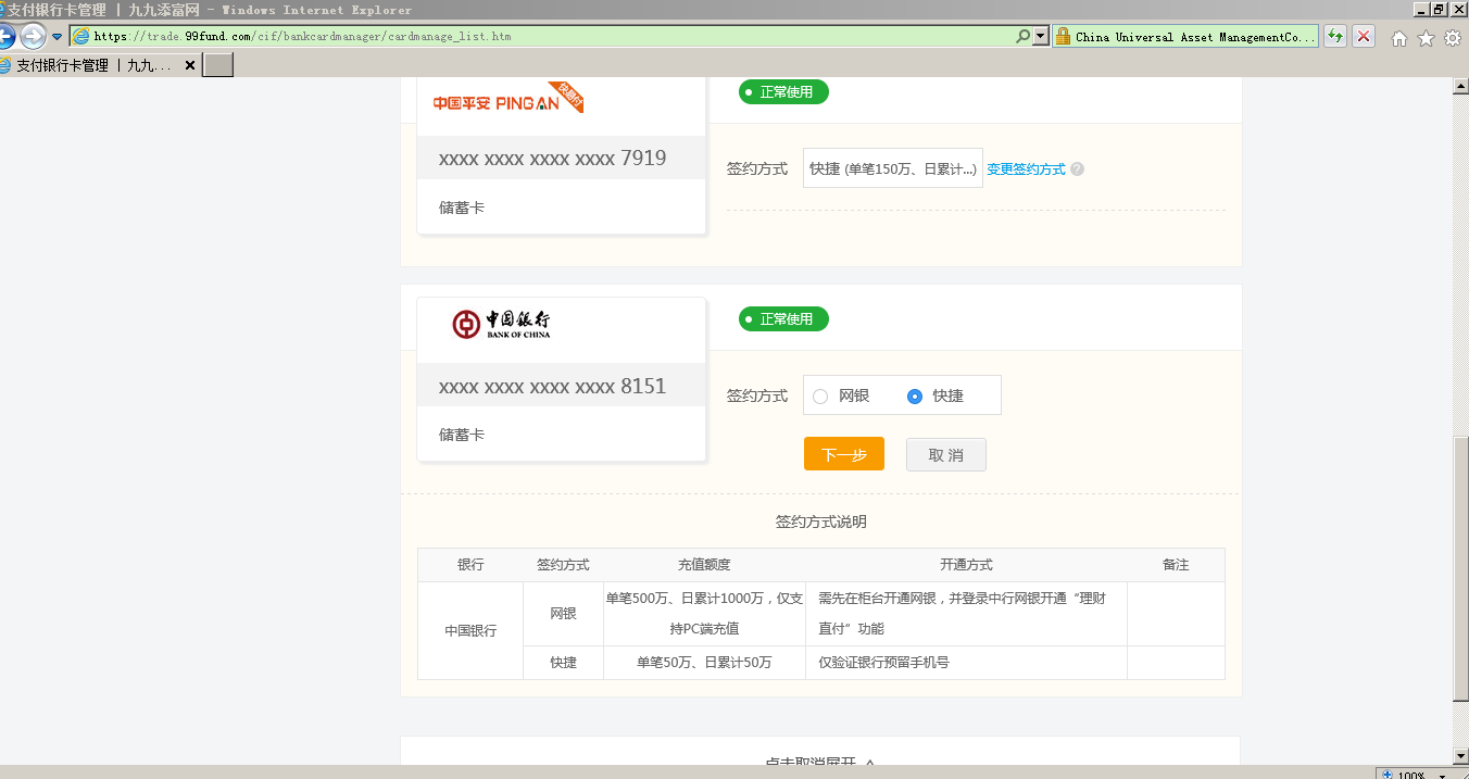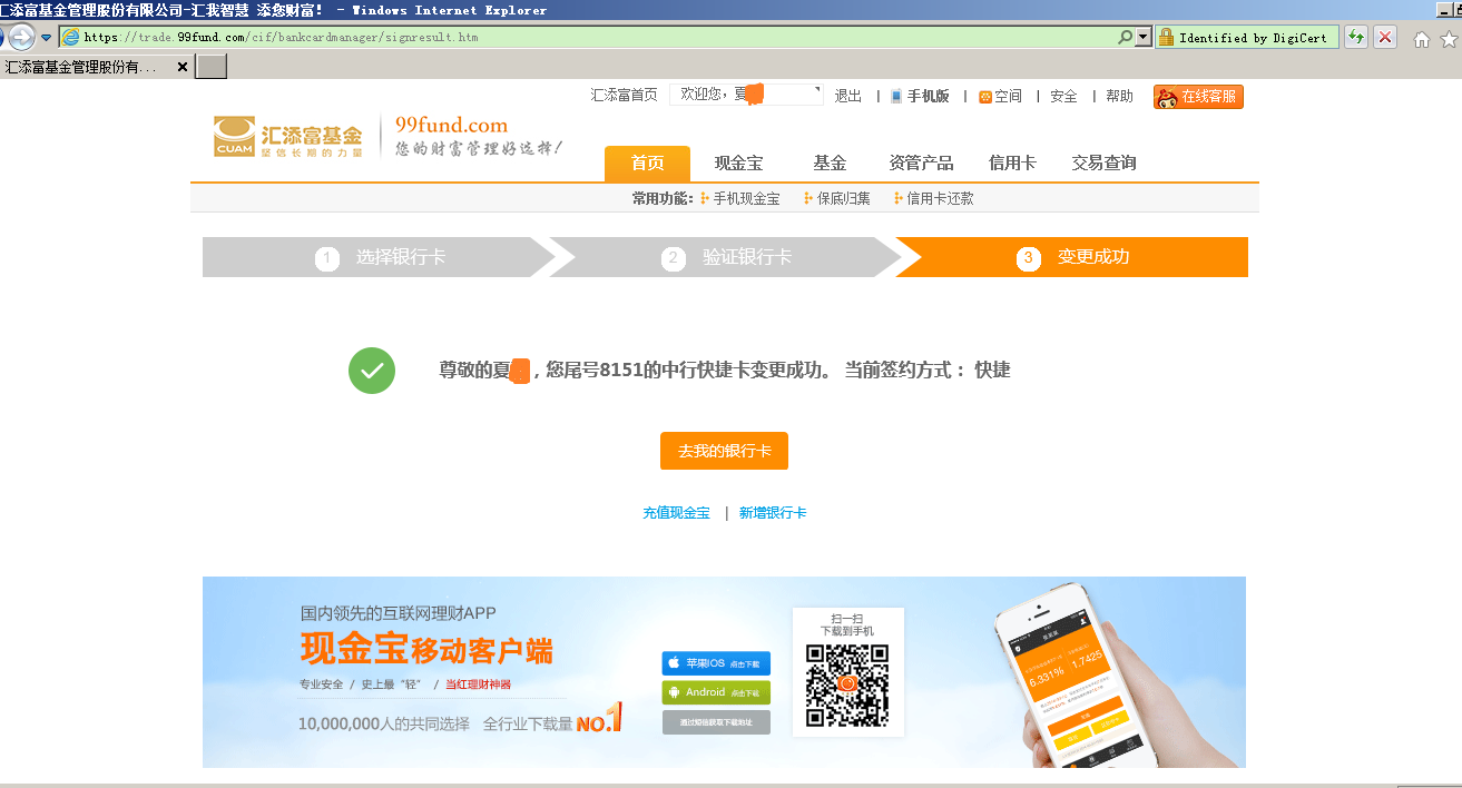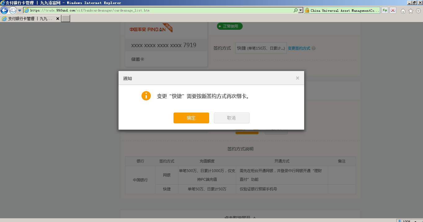 第一步 (App不支持操作)通過匯添富官網(wǎng)(www.www.yataow.com)網(wǎng)頁登錄現(xiàn)金寶賬戶,點(diǎn)擊“首頁”-“銀行卡管理”,點(diǎn)擊“變更簽約方式” ,選擇“快捷”模式