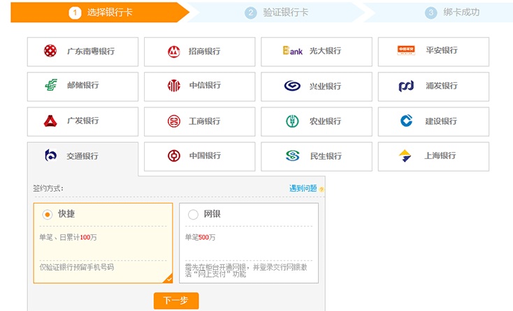 2、點(diǎn)擊“交通銀行”,選擇“交行快捷”,點(diǎn)擊“下一步”。