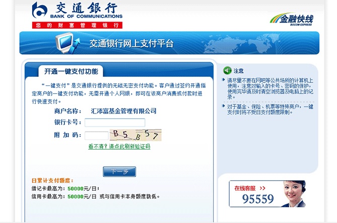 4、進(jìn)入交通銀行網(wǎng)上支付平臺(tái),在“開通一鍵支付功能”頁面,輸入銀行卡號(hào)及附加碼,點(diǎn)擊“下一步”。