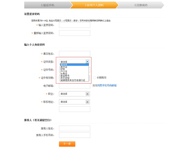 第三步:補(bǔ)充個(gè)人資料,選擇的證件類型請(qǐng)與您銀行卡開(kāi)戶證件類型保持一致。