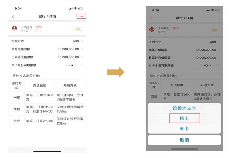 1.App端:登錄現(xiàn)金寶手機App—我的—銀行卡—點擊需更換的銀行卡—換卡,根據(jù)頁面提示流程操作即可。