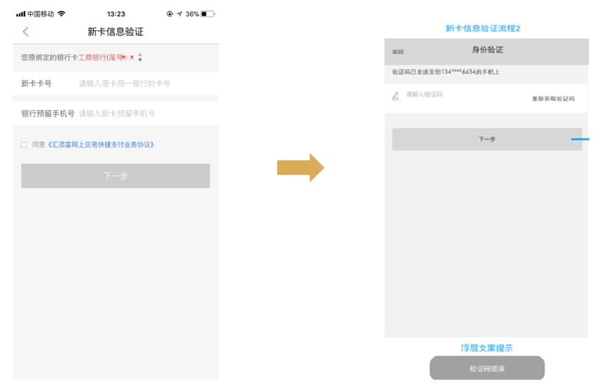 1)若新卡未綁定:輸入銀行卡號+銀行預留手機號 → 短信驗證碼