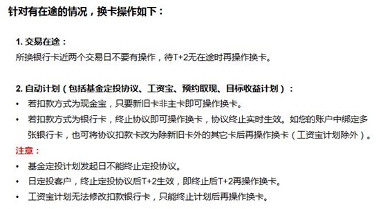 2.若您有定投協(xié)議(定投、工資寶、預約取現(xiàn)等)請您先暫停計劃,待換卡完成后,可重新開通相應計劃!如有在途交易請于2個交易日后再操作換卡。
